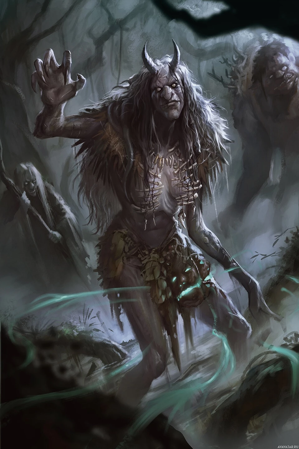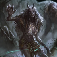 На картинке изображено фантастическое существо, похожее на демона или мифического монстра. Оно имеет необычную гуманоидную форму с заостренными ушами, мехом и рогами на голове. Существо окружено темным и мистическим окружением, возможно, представляющим лес или пещеру, что создает потустороннюю атмосферу. Этот персонаж может быть из фантастической истории, игры или мифологии.