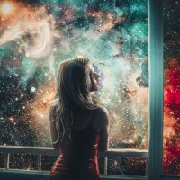 a breathtaking view of the cosmos. She appears to be lost in thought or contemplation as she looks out onto the vibrant and colorful galaxy that fills