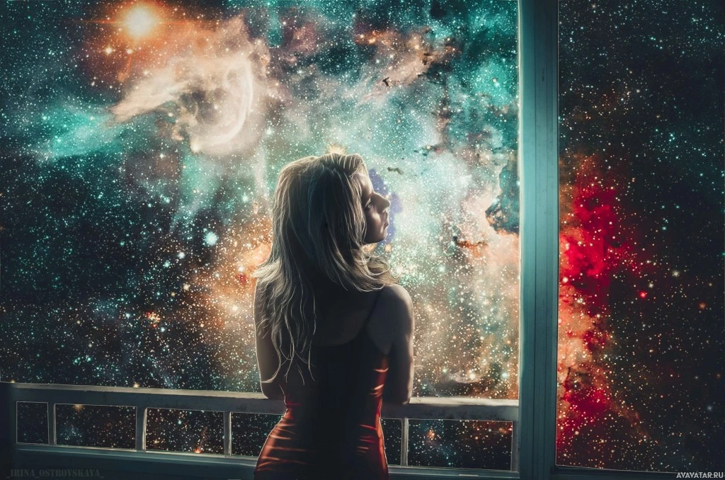 the window frame. The colors are predominantly blue, red, orange, and white, which suggest nebulas, stars, and planets. The woman is dressed elegantly with