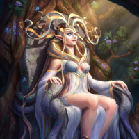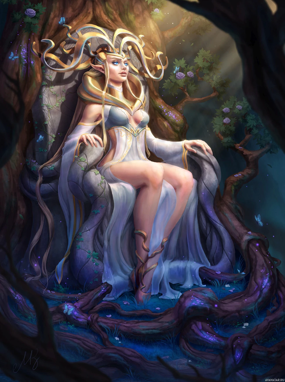 The image features a fantasy-themed artwork of an elf. The elf is depicted with a serene and regal demeanor, sitting on what appears to be a throne made from natural elements such as