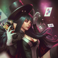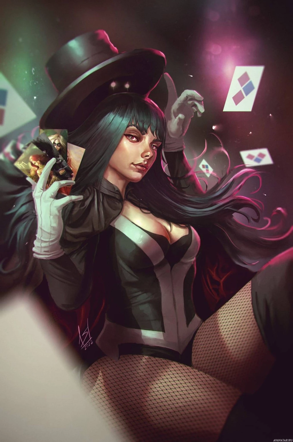 The image depicts a character styled after Zatanna, a fictional superheroine from the comic book universe of