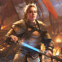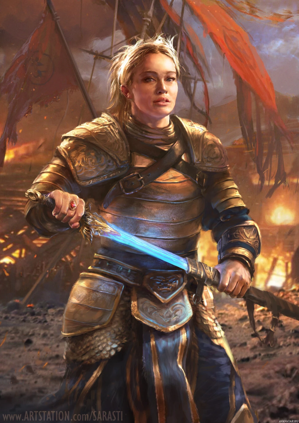 blonde hair, is wearing armor with gold accents, and holds a sword in her right hand, which suggests she may have a role as a warrior or adventurer. The background includes what seems to be chaos or destruction, possibly indicating that the character is in