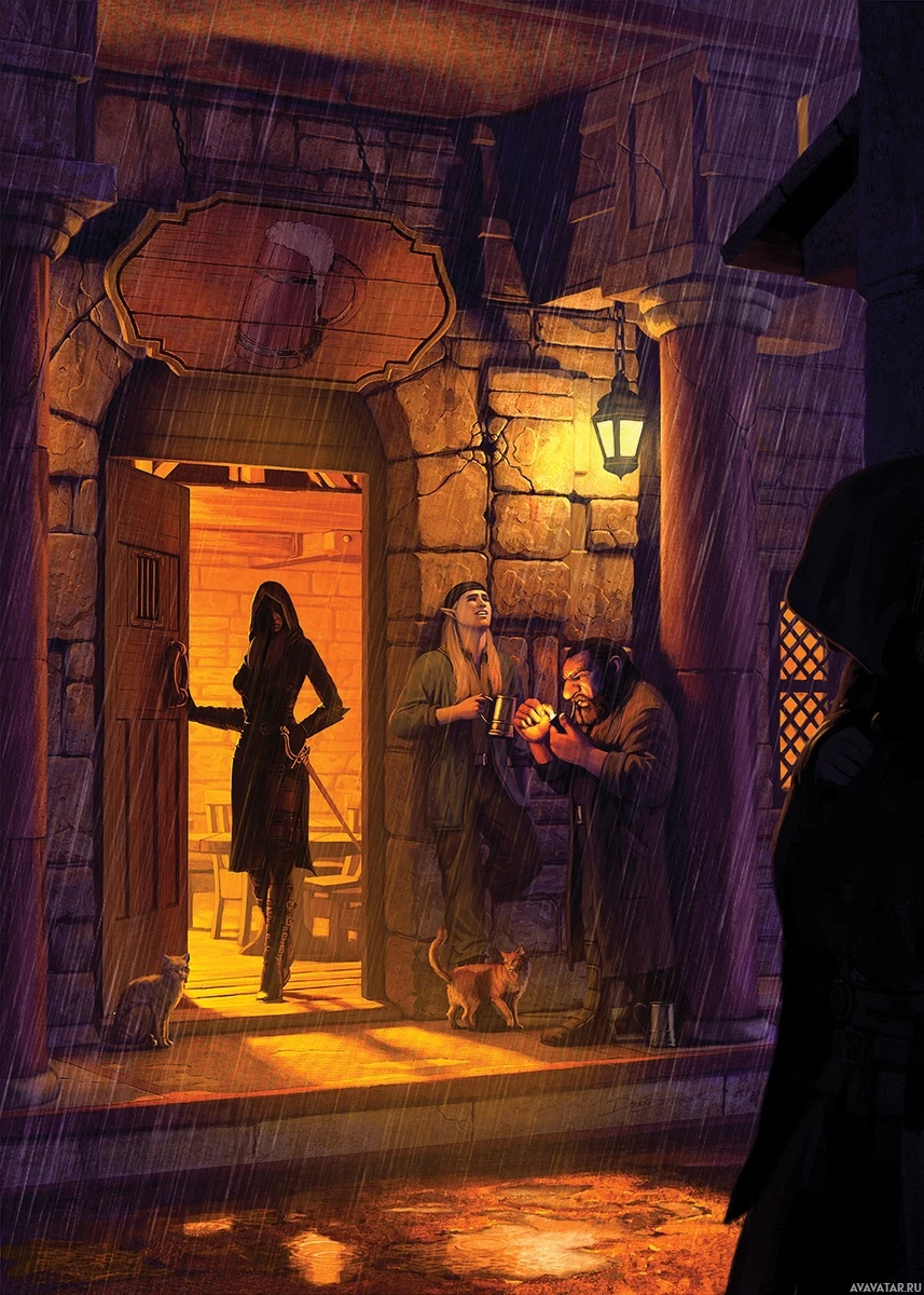 the entrance of the building, looking out into the rain. 5. A woman with a lantern standing behind the man at the table, possibly participating in their conversation or activity. She is holding her cloak over her head to stay dry from the rain. The atmosphere suggests a narrative where fantasy elements coexist with everyday life, perhaps indicating a storyline that involves both human and non-human characters interacting within a shared environment. The image evokes a sense of mystery and intrigue, as well as a touch of melancholy due to the rain and damp surroundings.