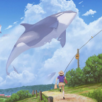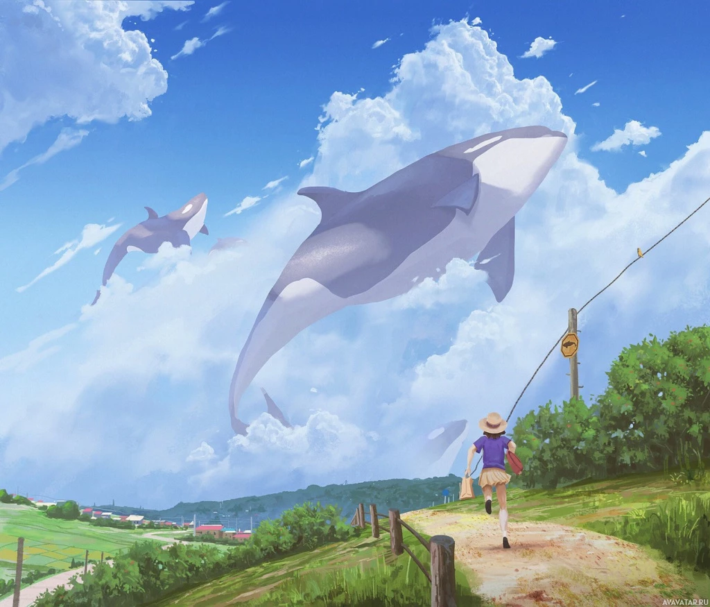 На картинке изображена причудливая сцена, в которой косатка (также известная как касатка-убийца) летит по небу. На переднем плане ребенок с рюкзаком бежит к океану, по-видимому, торопясь увидеть косаток вблизи. Кажется, что это прибрежная зона с чистым голубым небом над головой и пышным ландшафтом внизу. В воздухе летают и другие киты, создавая атмосферу фантазии и воображения.