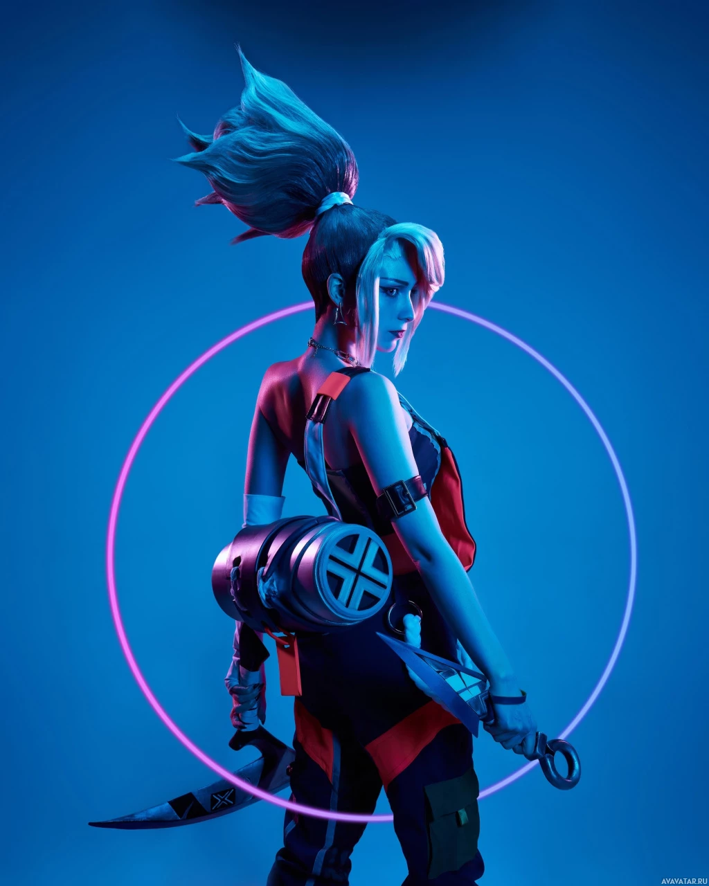 The image depicts a character dressed in cosplay, emulating the attire and pose of Akali from the popular game "