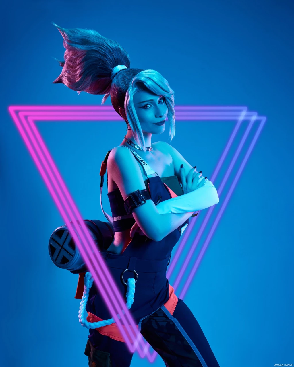 the video game "League of Legends." The individual is dressed in costume that includes a bodysuit, gloves, and has wristbands with what appears to be some