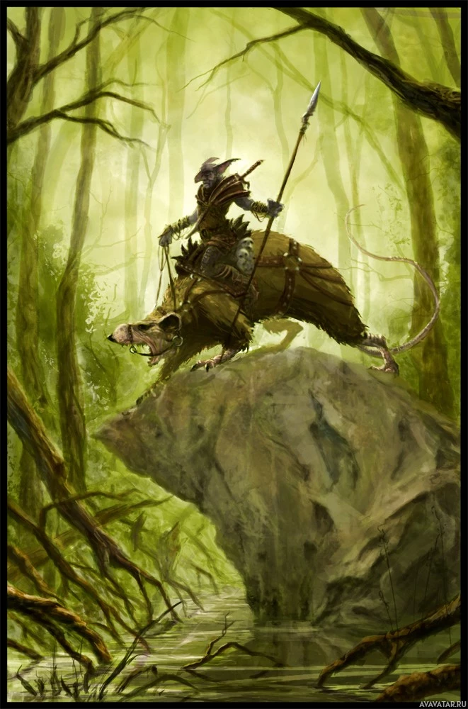a fantasy scene featuring a character riding on the back of a giant rat-like creature in what appears to be a forest setting. The character is wearing armor and wielding a sword, suggesting they might be an adventurer or warrior. The rat-creature has prominent features like long ears and