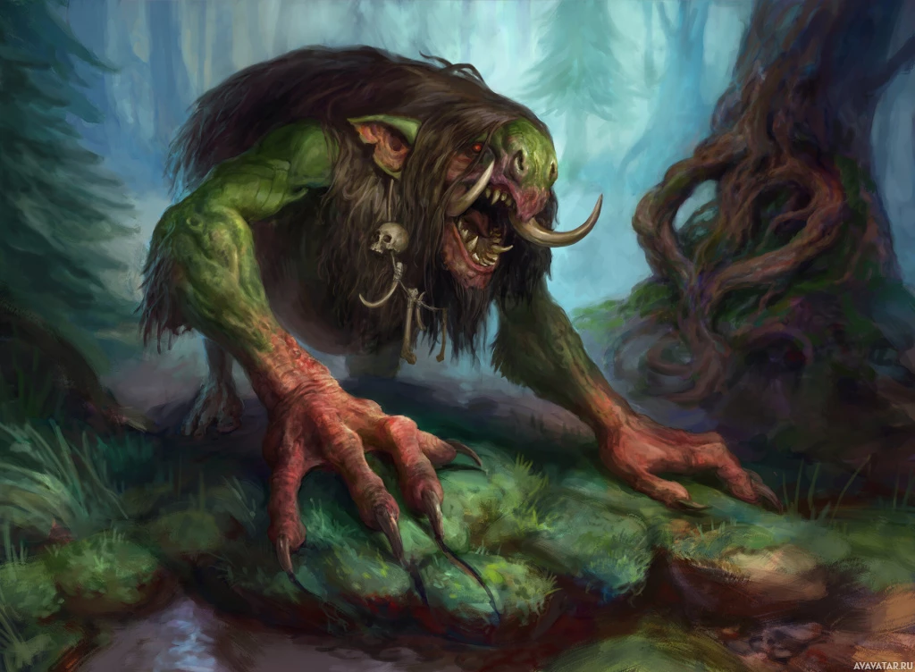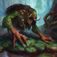 The image depicts a fantasy-themed scene featuring a humanoid creature with exaggerated features reminiscent of