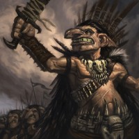 a fantasy scene with a figure that appears to be a goblin warrior. He is holding what looks like a weapon and is surrounded by figures that seem to be corpses or skeletons, suggesting he may have defeated these opponents in battle. The character is wearing armor and a helmet, which adds to the combat-ready appearance. The background shows
