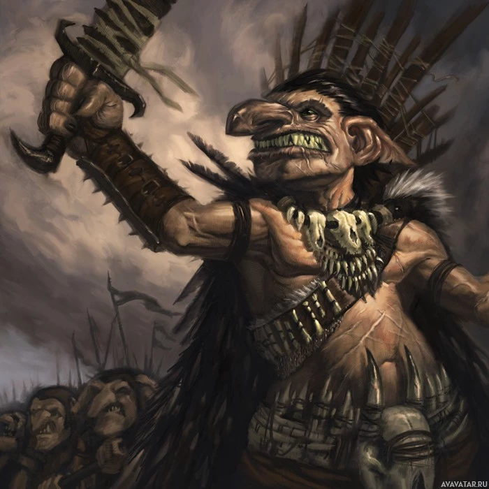 a cloudy sky, indicating either dawn or dusk, and there's a sense of triumph or victory being displayed by the goblin.