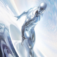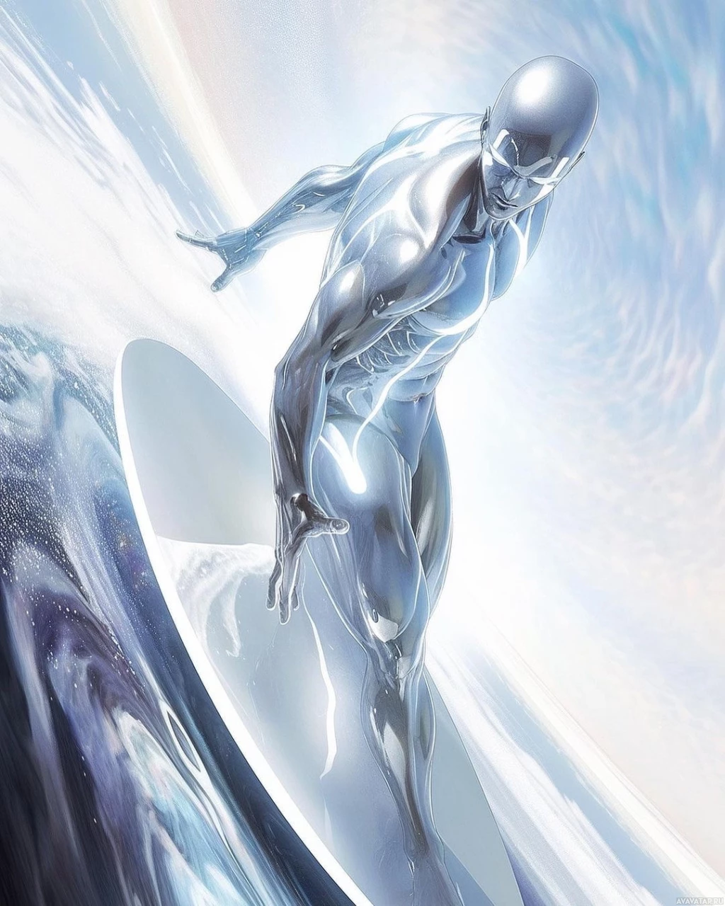 На картинке изображен Серебряный серфер, персонаж комиксов Marvel. Он катается на доске для серфинга по чему-то похожему на волну в космосе, на космическом фоне, который включает звезды и туманности.