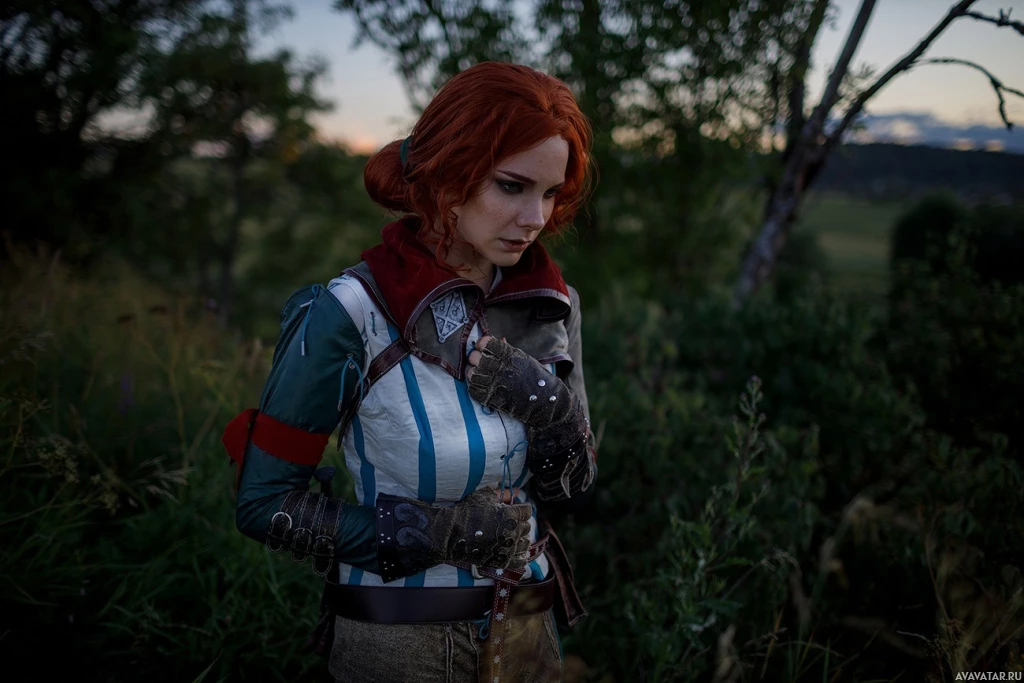 The image depicts a person dressed in cosplay attire that resembles Triss Merigold from