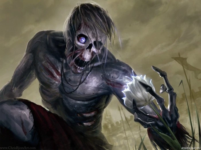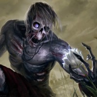 The image shows a fantasy-themed depiction of a character that appears to be undead or a zombie. The character has pale, sallow skin and dark circles around the eyes, which are typical characteristics of a zombie in