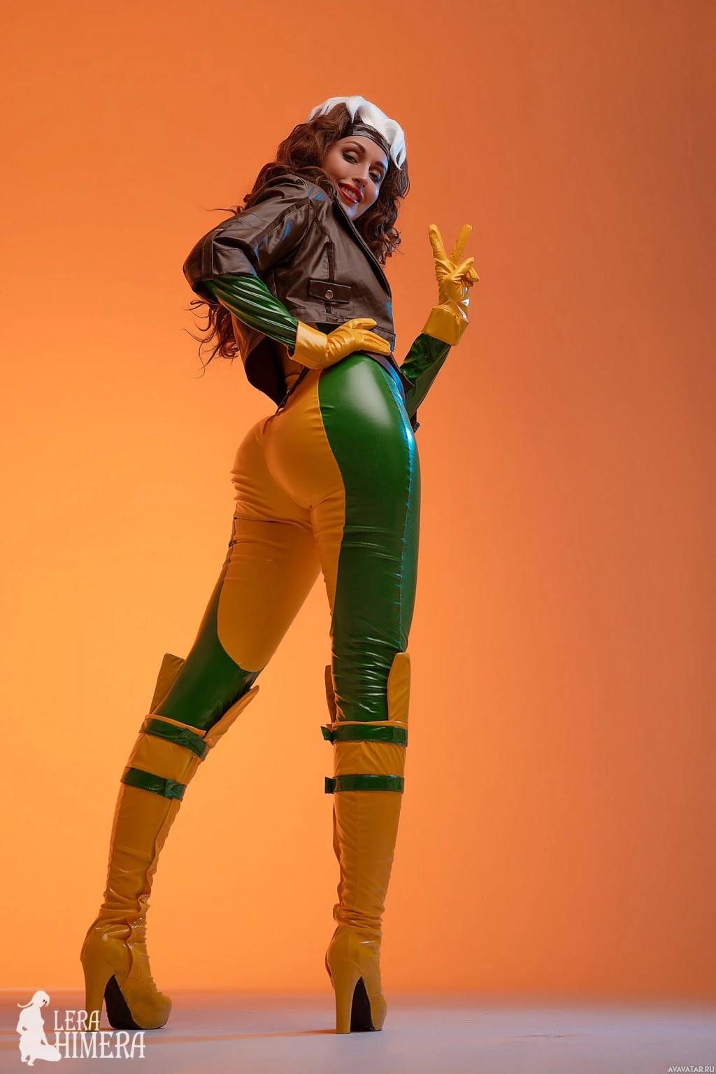 the X-Men comics and movie series. The person is wearing a costume that consists of green and yellow bodysuit with large shoulders and boots, along with gloves, which are characteristic features of Rogue's outfit. They have
