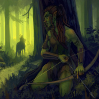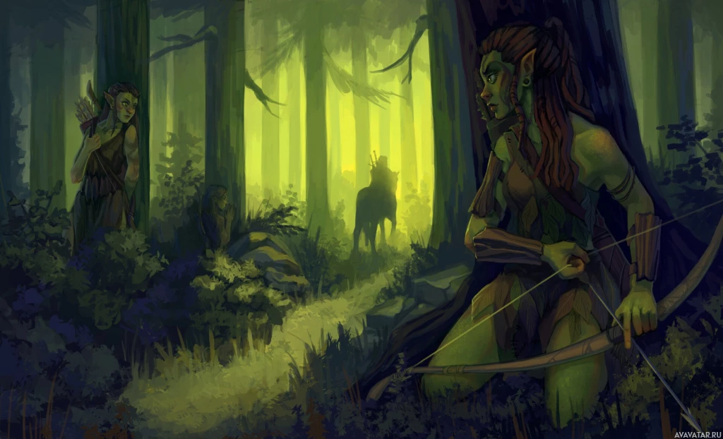 long hair and green skin, holding a bow and standing near a tree with a hood over their head, suggesting a sense of stealth or hiding. To the right, another figure is depicted with brown fur and pointed ears, wearing