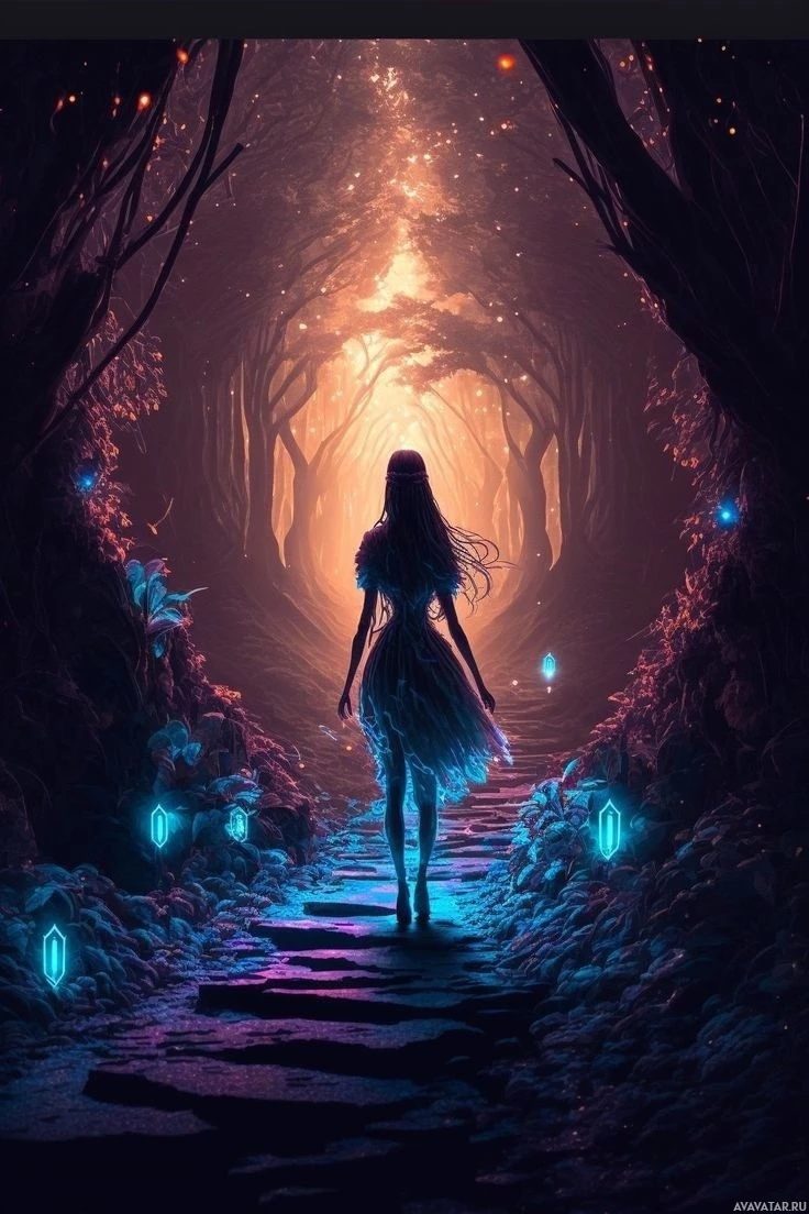 long hair. The forest around her glows with