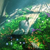 a small rabbit. The rabbit is sitting on the ground, surrounded by what appears to be a garden or wildflowers, as there are