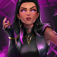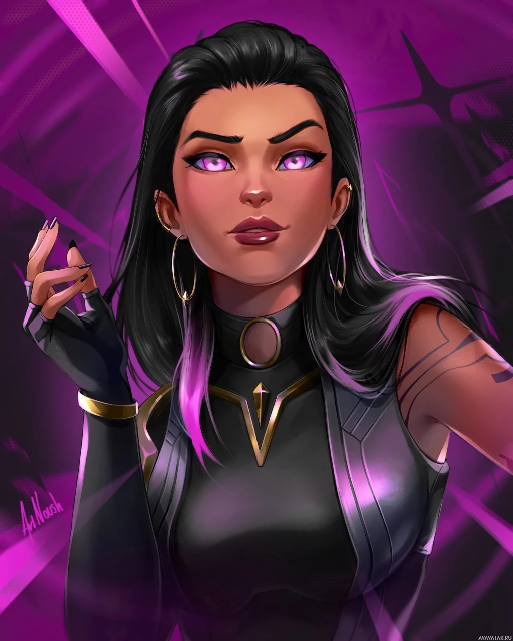 a female character with dark hair and striking purple eyes. She is wearing what appears to be armor or a costume, with black elements and some