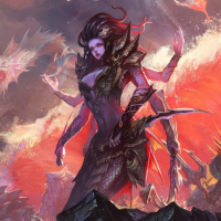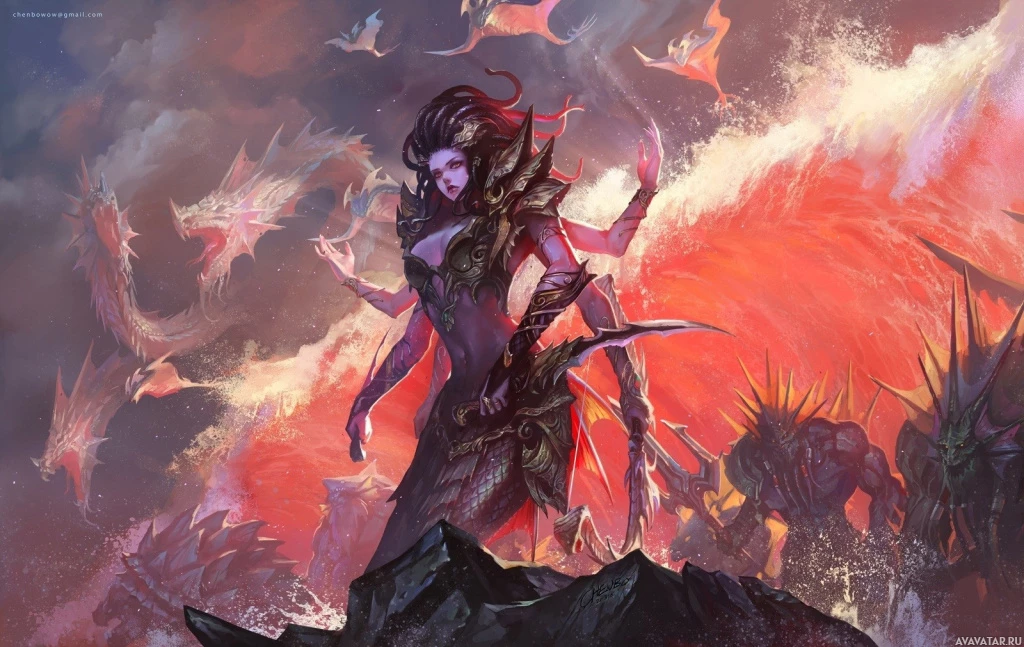 a rock formation amidst fiery and dark clouds, suggesting a scene of battle or confrontation. The naga's armor and weapons are intricately detailed, indicating its warrior status within