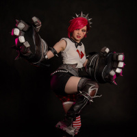 League of Legends." The individual is wearing a costume that represents Vi's appearance and attire, which includes her iconic armor with spiky details and a helmet with