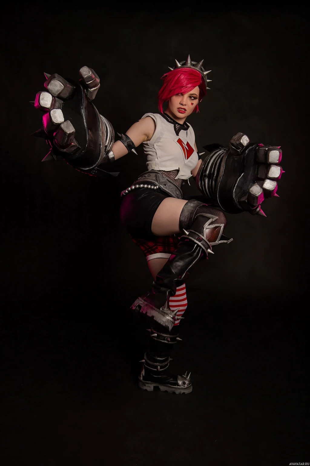 The image shows a person dressed in cosplay as Vi, a character from the popular online multiplayer game "