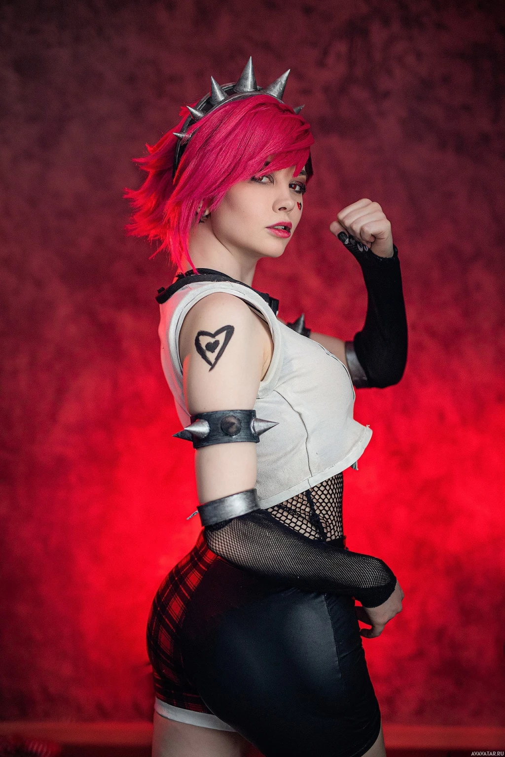 pink hair, a crown adorned with spikes on top, and a distinctive outfit that includes elements like armor and bandages. The individual is posing confidently with one hand on their hip and the other fist clenched, giving off an assertive vibe fitting Vi's character.