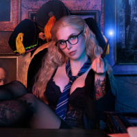 The image shows a person sitting at a desk, wearing glasses and what appears to be a costume with