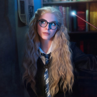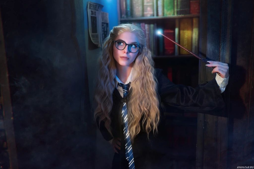 the Harry Potter series, which includes glasses, a robe with the Gryffindor house colors, and a wand. They are standing in what appears to be a room filled with books or a library setting that gives an atmosphere of being at