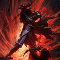The image features a warrior with a sword. They are surrounded by an intense battle scene with fiery elements and other figures that appear to be enemies or foes. The warrior is in an action pose, suggesting they are either attacking or preparing for combat.