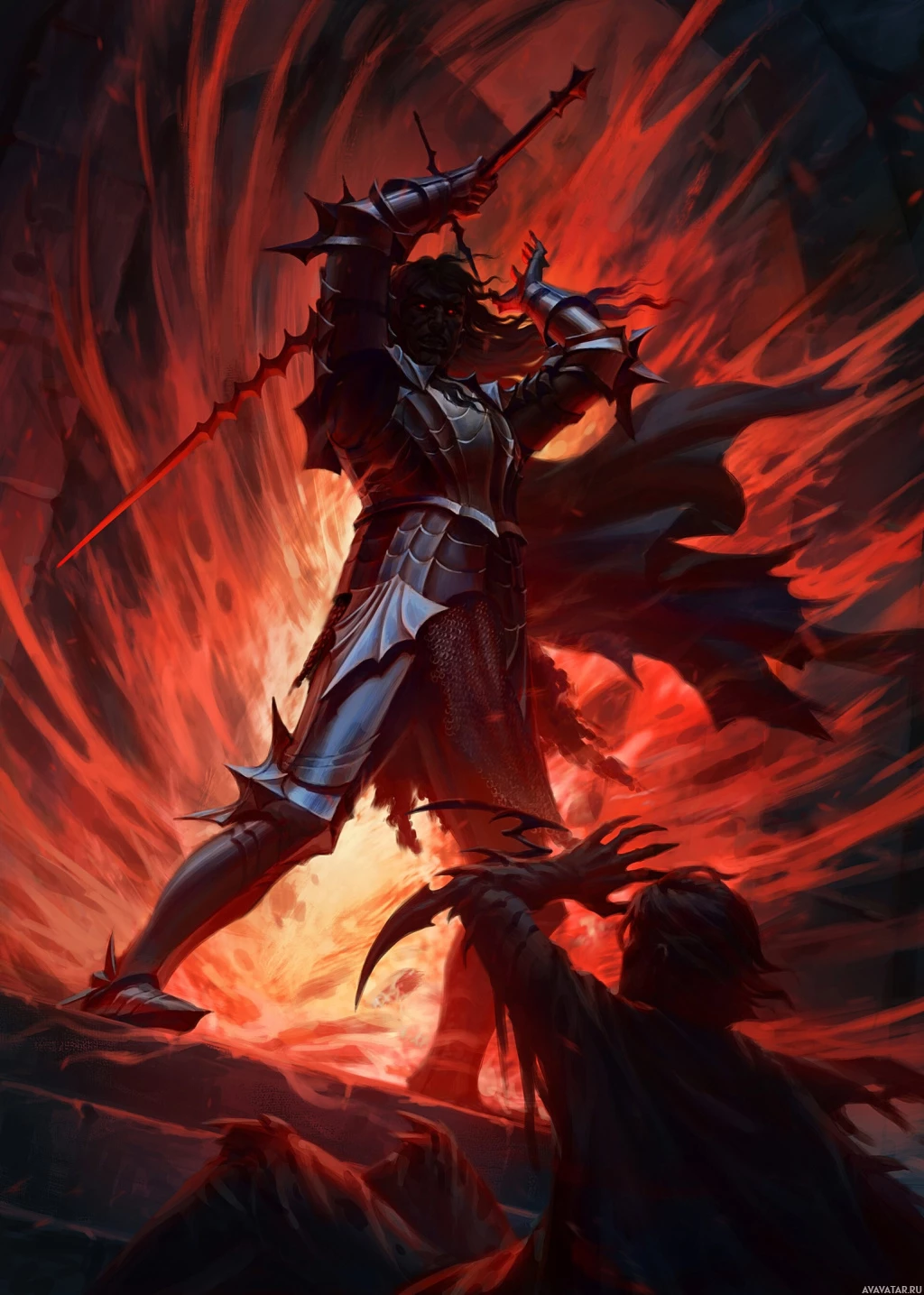 На картинке изображен воин с мечом. Они окружены сценой напряженной битвы с огненными элементами и другими фигурами, которые кажутся врагами. Воин стоит в боевой позе, что позволяет предположить, что он либо атакует, либо готовится к бою.