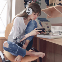 a video game. She's wearing headphones, which suggests she is listening to audio from the game or perhaps