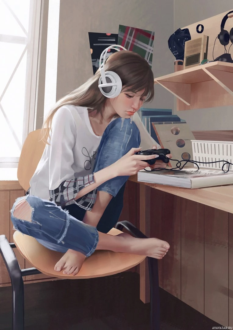 an audio source separate from the game itself. There are various items around her, such as books and what appears to be