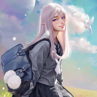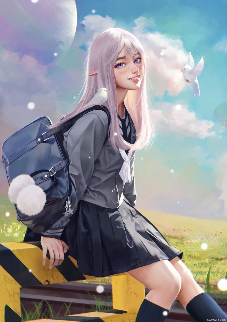 a school uniform, consisting of a short skirt, blouse, and tie, along with a backpack. The background suggests a whimsical or magical environment, possibly indicating that this character attends a school set in