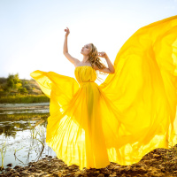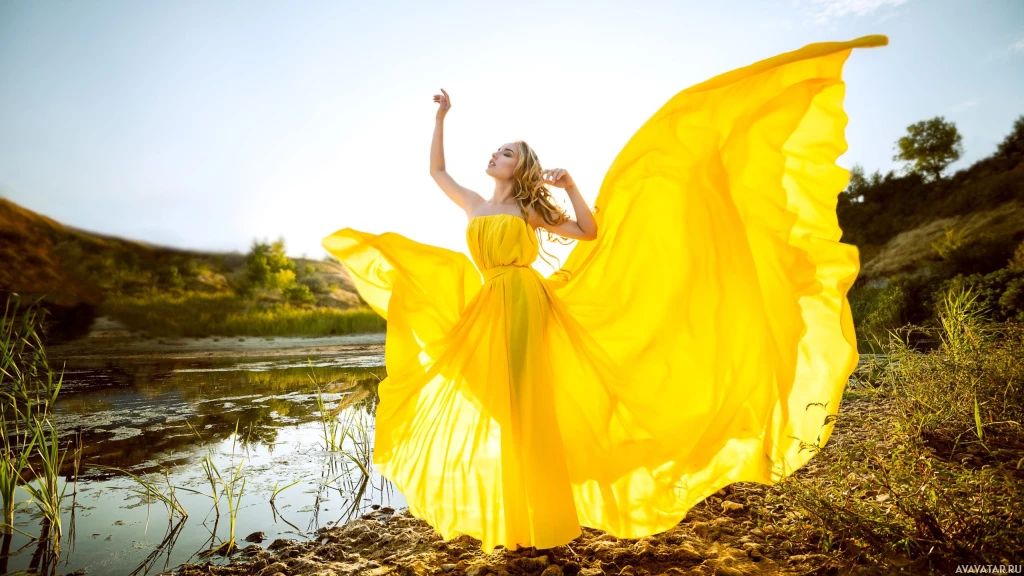 a yellow dress with long, flowing fabric that creates an elegant and dreamlike appearance. She is standing near the edge of
