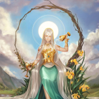 a small flower, suggesting a connection to nature or perhaps divine beauty. In the other hand, she holds what looks like a staff or wand, which could symbolize her role as a mystical being or leader within