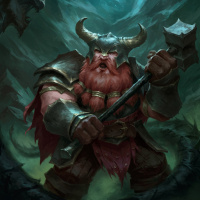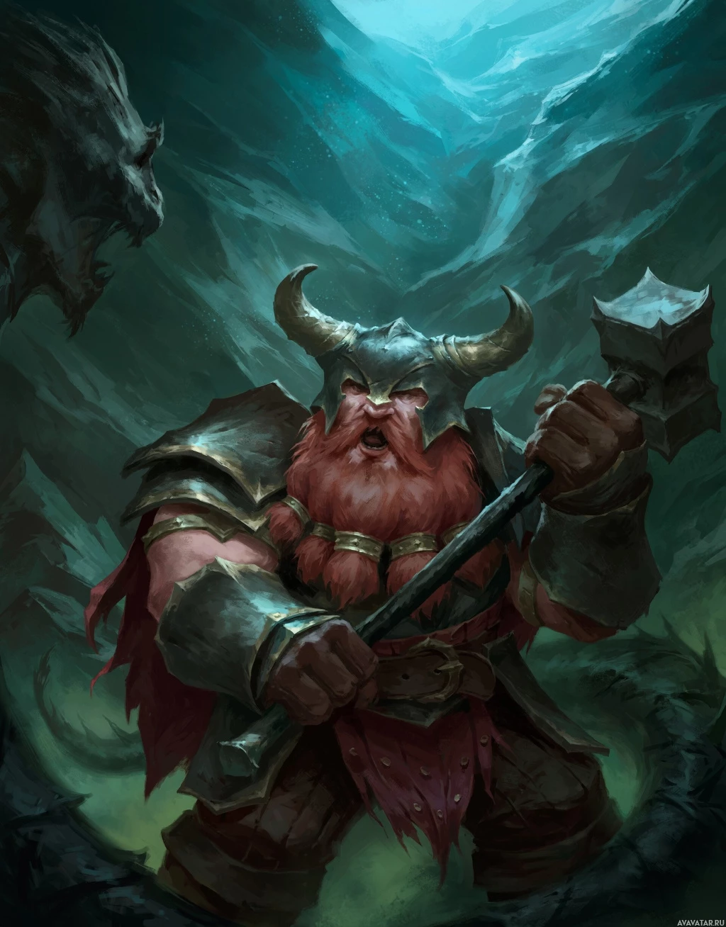 large horns and a beard that adds to the mythical appearance of the character. He's holding a hammer in one hand, suggesting he may be a blacksmith or warrior. The background features dark, misty mountains, adding to