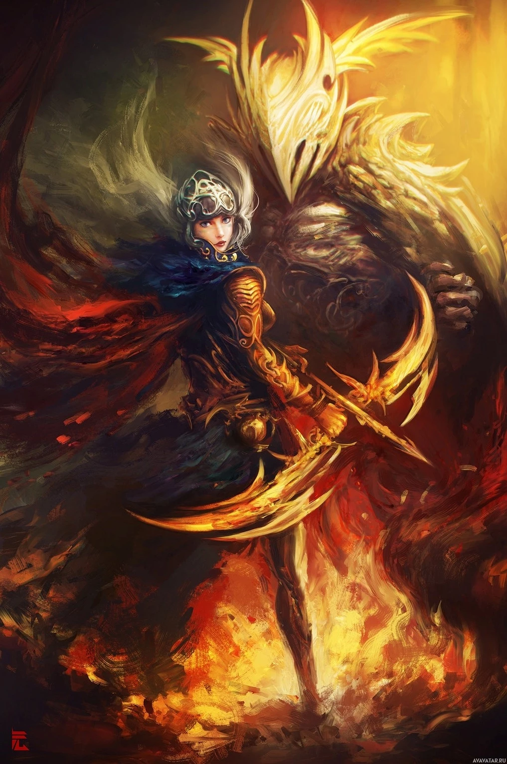 a scene of destruction, with fire and smoke around her. The character's pose and expression convey confidence and readiness for combat. This image could be part of a larger narrative within