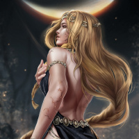 a full moon, with a forest-like environment around her.
