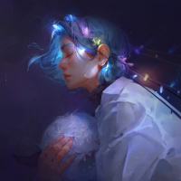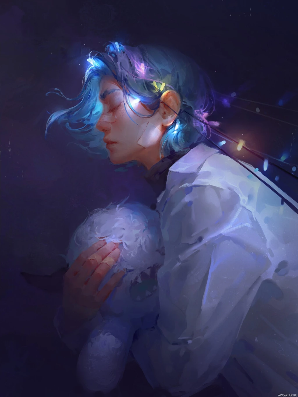 blue hair, closed eyes, and a thoughtful or dreamy expression. She appears to be wearing