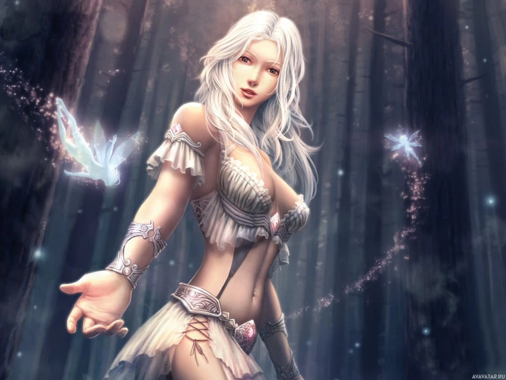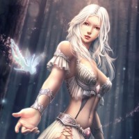 a female character with blonde hair, styled in an elegant manner. She appears to be wearing some sort of mystical or magical armor that enhances her fantasy-like appearance. The character is standing amidst what looks like a forest or a magical grove, as indicated by the misty background and the presence of fairies, which are common in