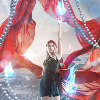 white hair and is dressed in a dark outfit with a red cape or robe that drapes over their shoulders. They are holding up one hand towards the sky, where magical
