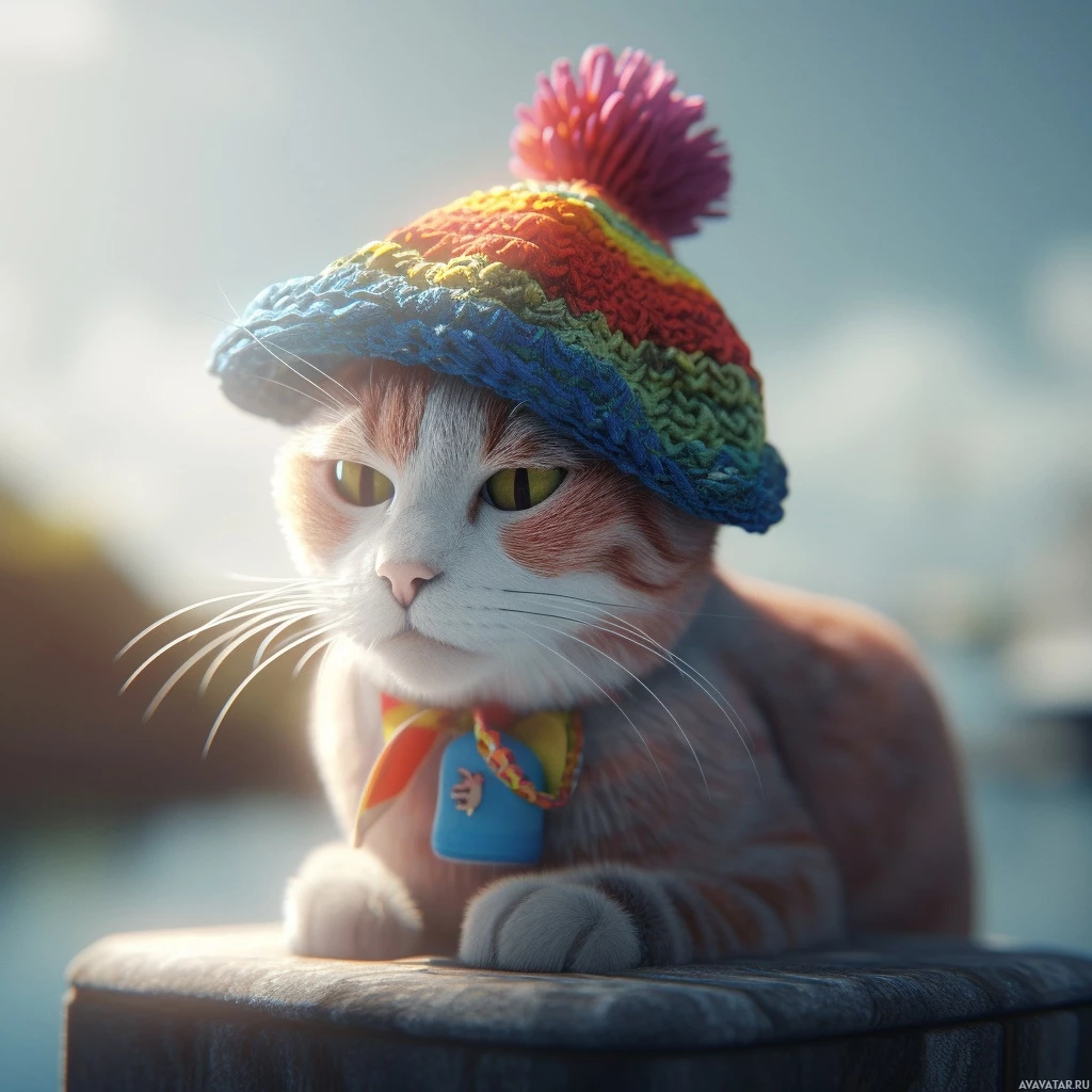 На картинке изображен кот в яркой вязаной шапочке и шарфе. Он сидит на чем-то похожем на причал или пирс, на заднем плане видно чистое небо над спокойной водой. Наряд кота позволяет предположить, что он может быть изображен одетым для холодных погодных условий.