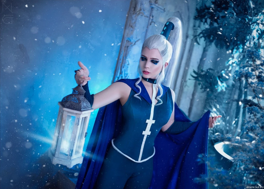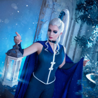 white accents, which could suggest a character associated with winter or magic in a fantasy context.