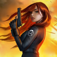 comic book-like illustration of the character Black Widow. She is depicted from behind with her hair flowing in the wind as if she has just been shot at, given the smoke and explosions in the background. She is wearing