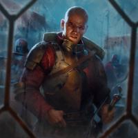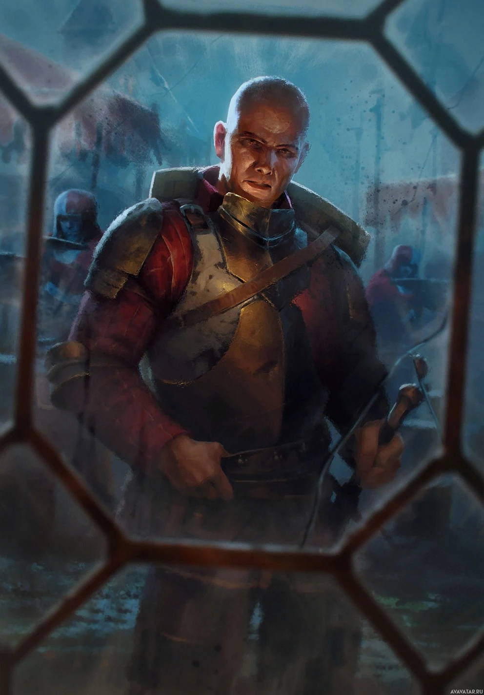 torn village. The character's expression suggests he is observing something with intensity, and his attire, including the chainmail armor and helmet, suggest he could be a knight or a soldier from