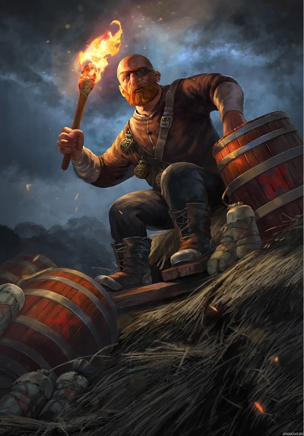 leather armor. He is holding a torch in one hand and what appears to be a barrel or container in the other, suggesting he might be preparing for an adventure or navigating through