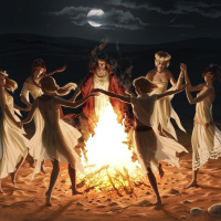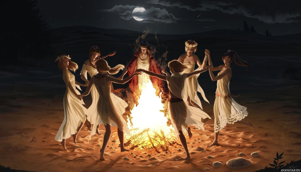 На картинке изображена группа людей, собравшихся ночью у костра. Центральная фигура изображена сидящей лицом к остальным, возможно, ведущей собрание или являющейся центром внимания. Окружающие фигуры стоят и, кажется, заняты какой-то общей деятельностью, например, танцем или общей песней. Атмосфера создает впечатление праздника или ритуала, происходящего под лунным небом.