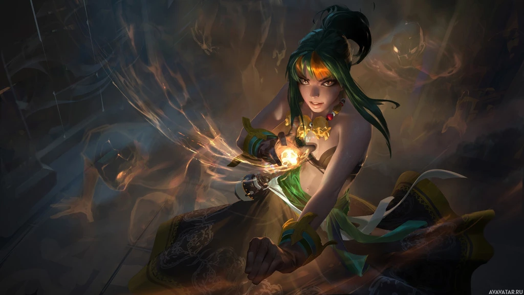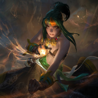game art. She has an elaborate outfit and appears to be engaged in some sort of magical or mystical activity involving
