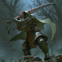 The image depicts a fantasy-themed warrior in a forested, foggy setting. The warrior is wearing armor and wielding a sword. They are standing on top of what appears to be the bodies of defeated enemies or creatures, indicating combat has recently occurred. The atmosphere suggests a battlefield or the aftermath of conflict in a fantasy world.