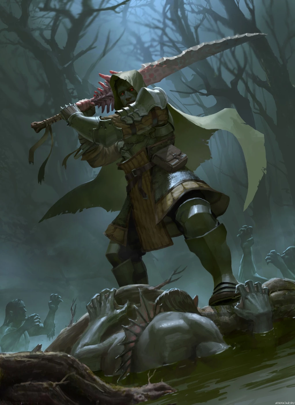 На картинке изображен воин в стиле фэнтези в окружении леса и тумана. Воин одет в доспехи и держит в руках меч. Они стоят на чем-то, что похоже на тела поверженных врагов или существ, что указывает на недавнее сражение. Атмосфера напоминает поле боя или последствия конфликта в фантастическом мире.